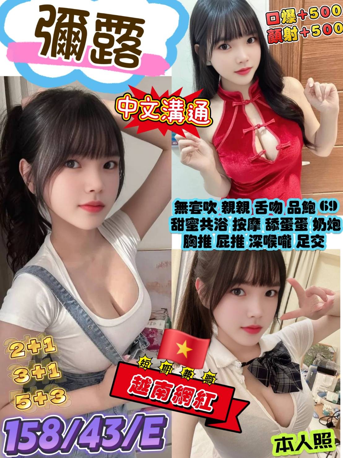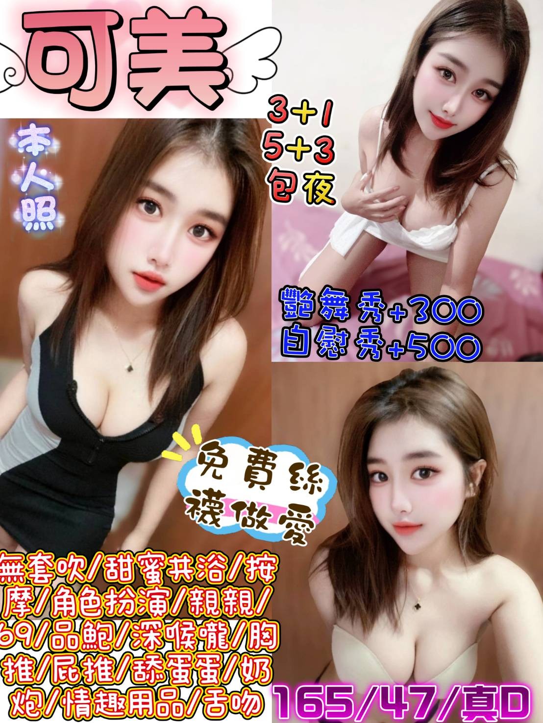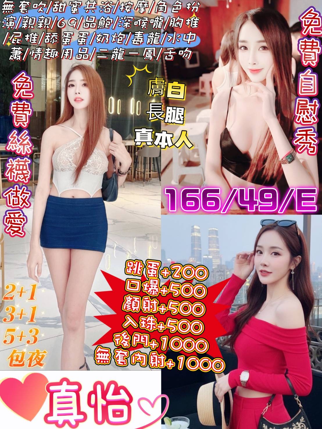 👍項目:無套吹/甜蜜共浴/按摩/角色扮演/親親/69/品鮑/深喉嚨/胸推/屁推/舔蛋蛋/奶炮/水中蕭/情趣用品/胸磨臉/ 漫遊+過水/入珠/外國人/二龍一鳳/舌吻